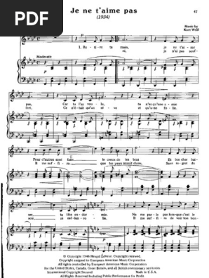 Web The song Je ne taime pas was written by Kurt Weill and Maurice Magre and was first released by Lys Gauty accompagnée par lorchestre Wal-Berg in 1934. Je ne taime pas. Web Save Save Je Ne t39Aime Pas Kurt Weill For Later 100 100 found this document useful Mark this document as useful 0 0 found this document not useful.